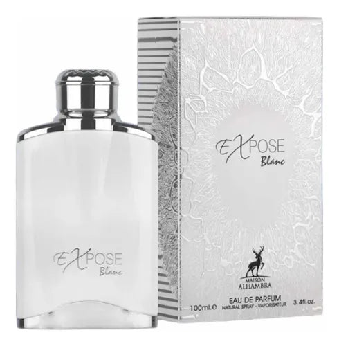 Expose Blanc de Maison Alhambra es una fragancia de la familia olfativa Aromática Acuática para Hombres. Expose Blanc se lanzó en 2022. Las Notas de Salida son pimienta rosa, bergamota y toronja (pomelo); las Notas de Corazón son lavanda, cardamomo y Notas acuáticas; las Notas de Fondo son almizcle blanco, madera de cachemira, maderas blancas y musgo de roble.